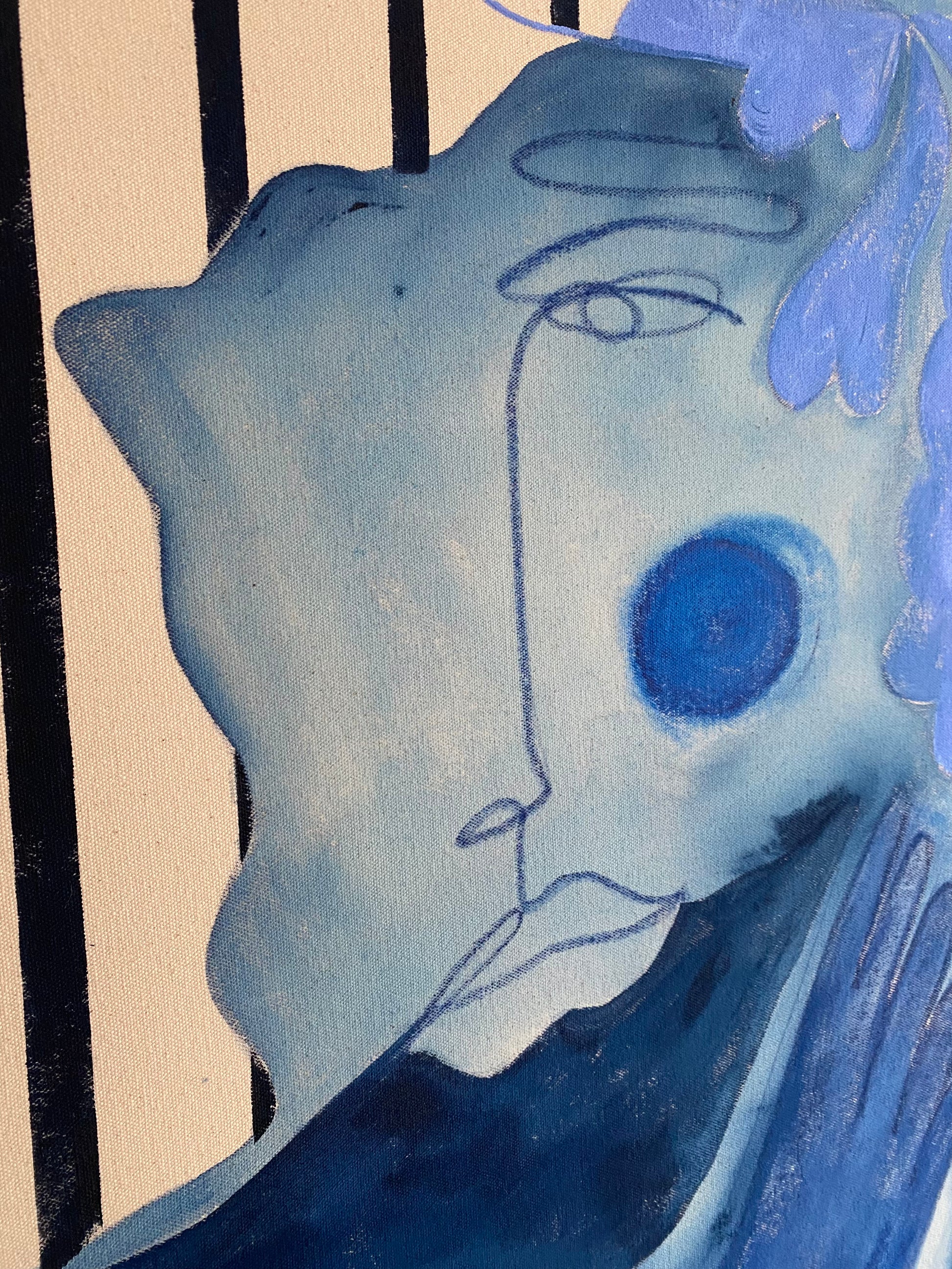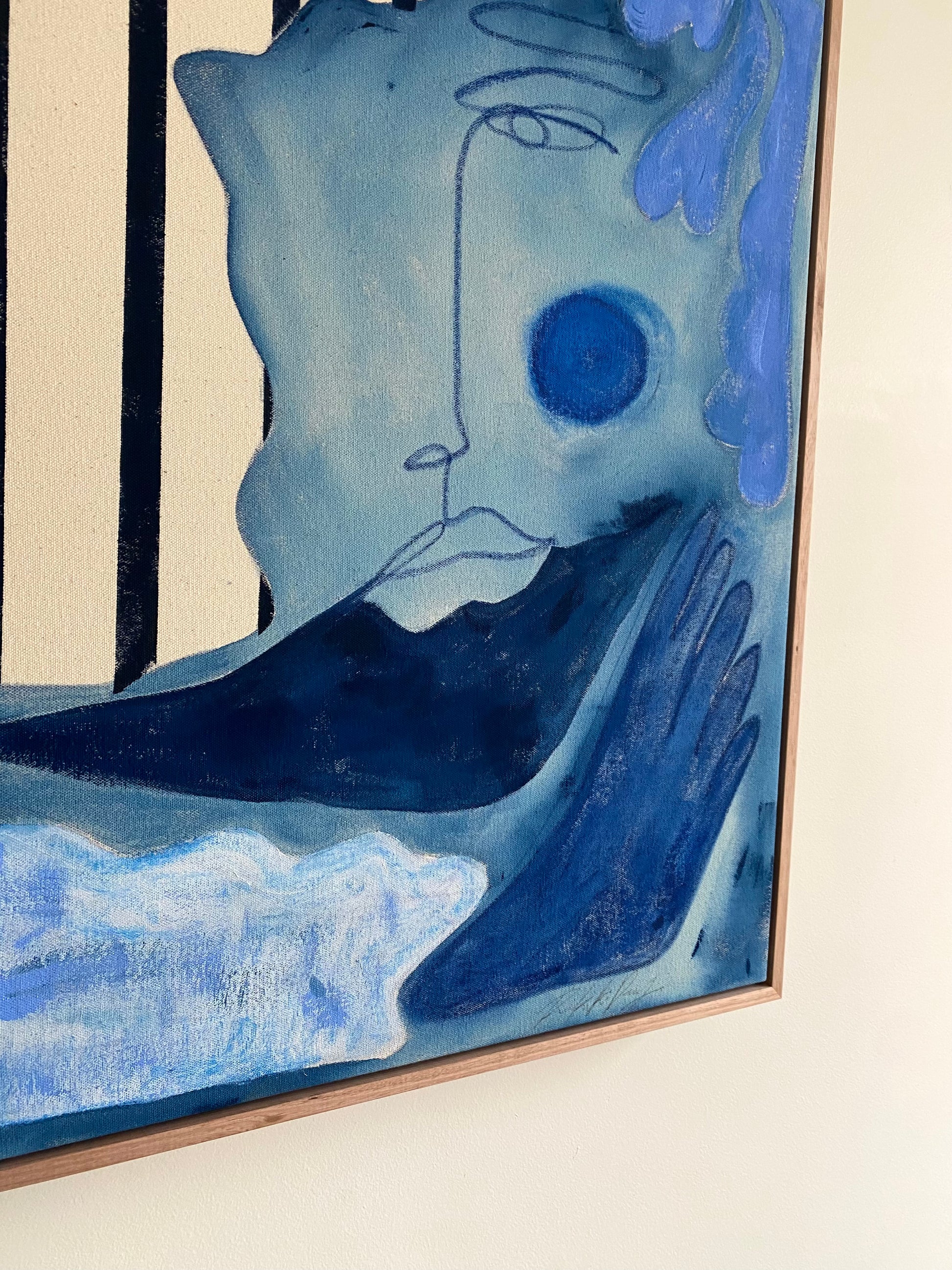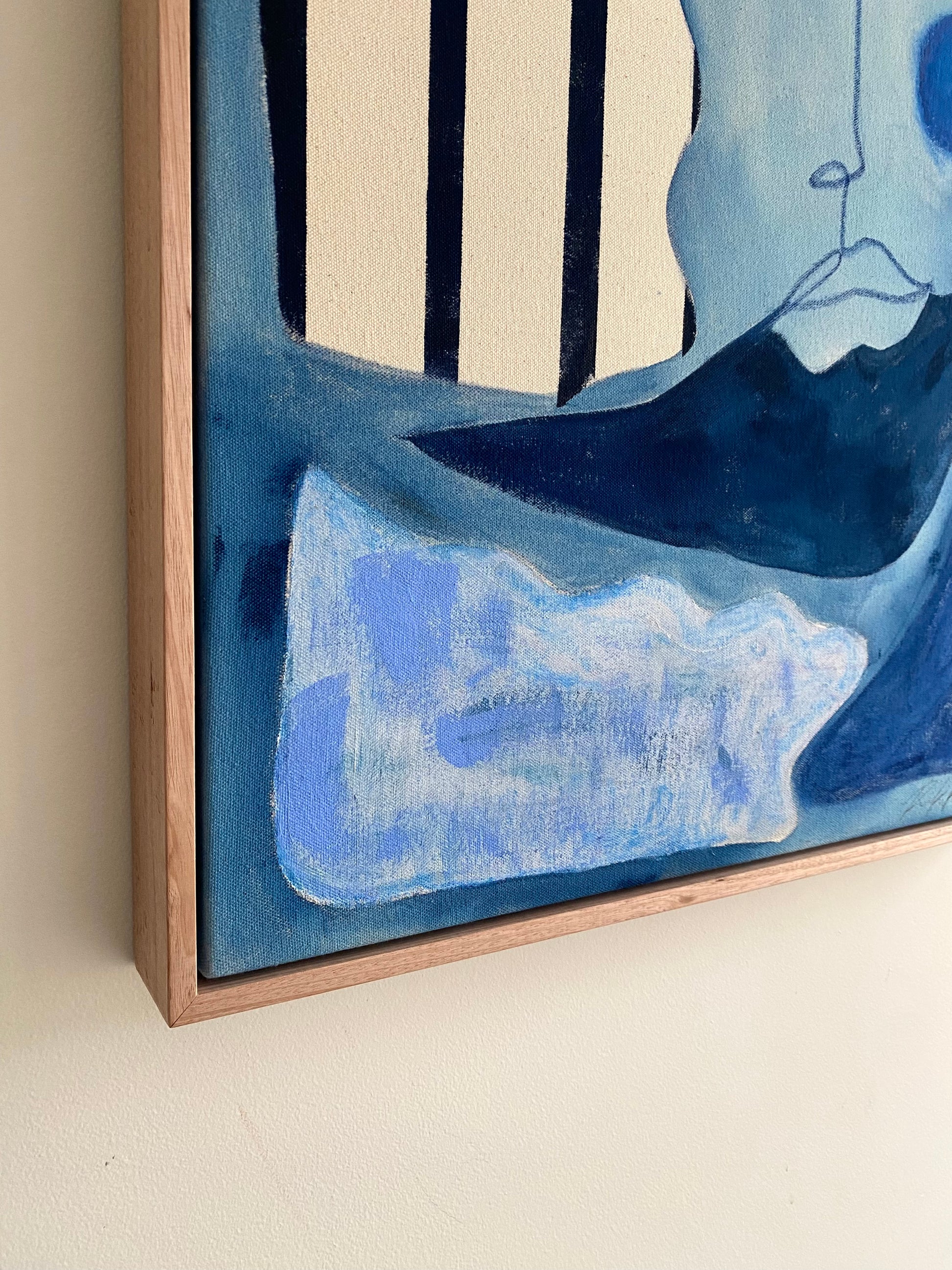 A piece that encapsulates the feeling of looking out to sea. A grounded peacefulness and fluid strength. A tonal blue colour palette reflective of the intricacies of the ocean, a comment on depth and perception. An ode to the healing power of the sea. This piece was envisioned whilst travelling the Costa Brava, Spain and looking out daily onto the deep blue hues of the Mediterranean Sea.