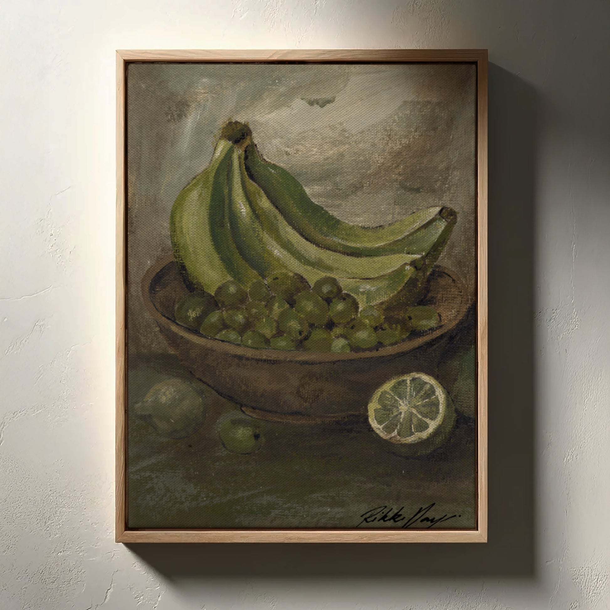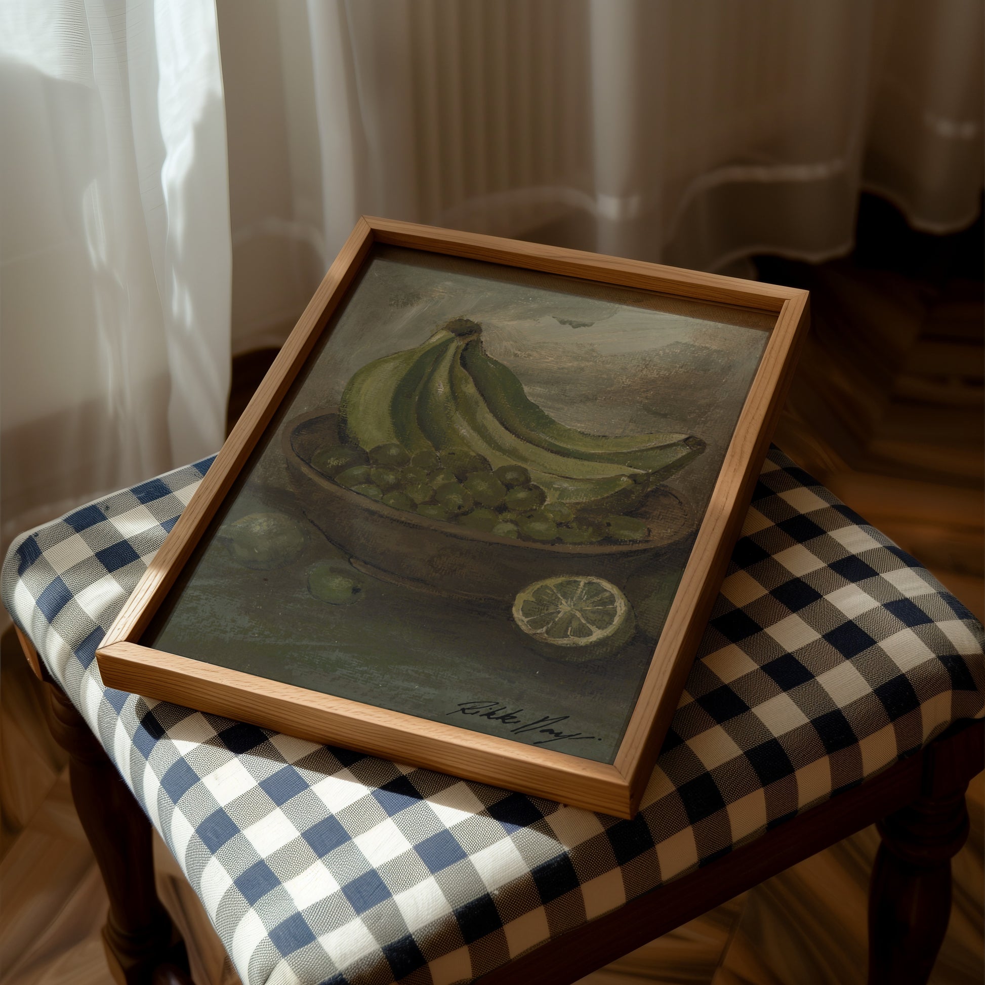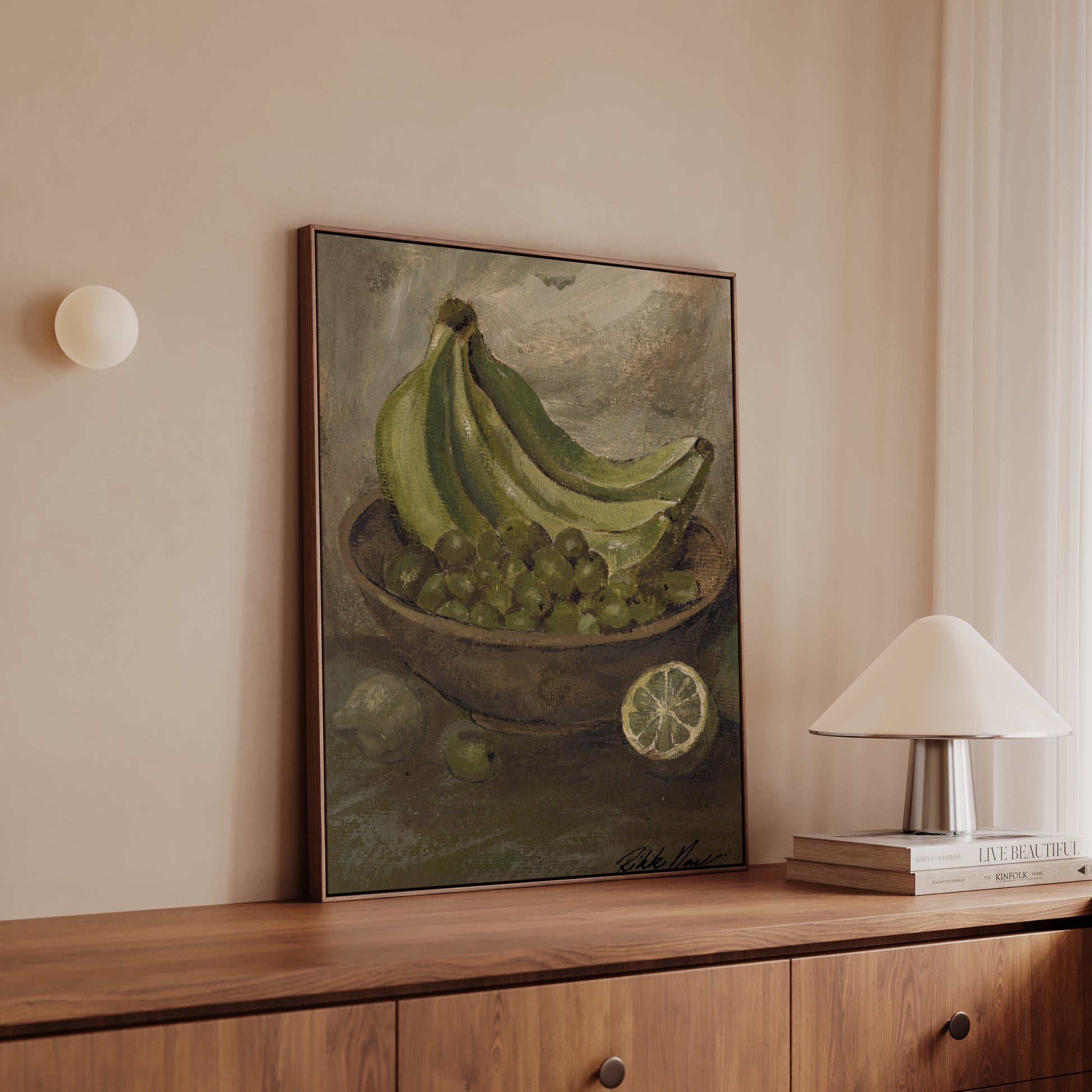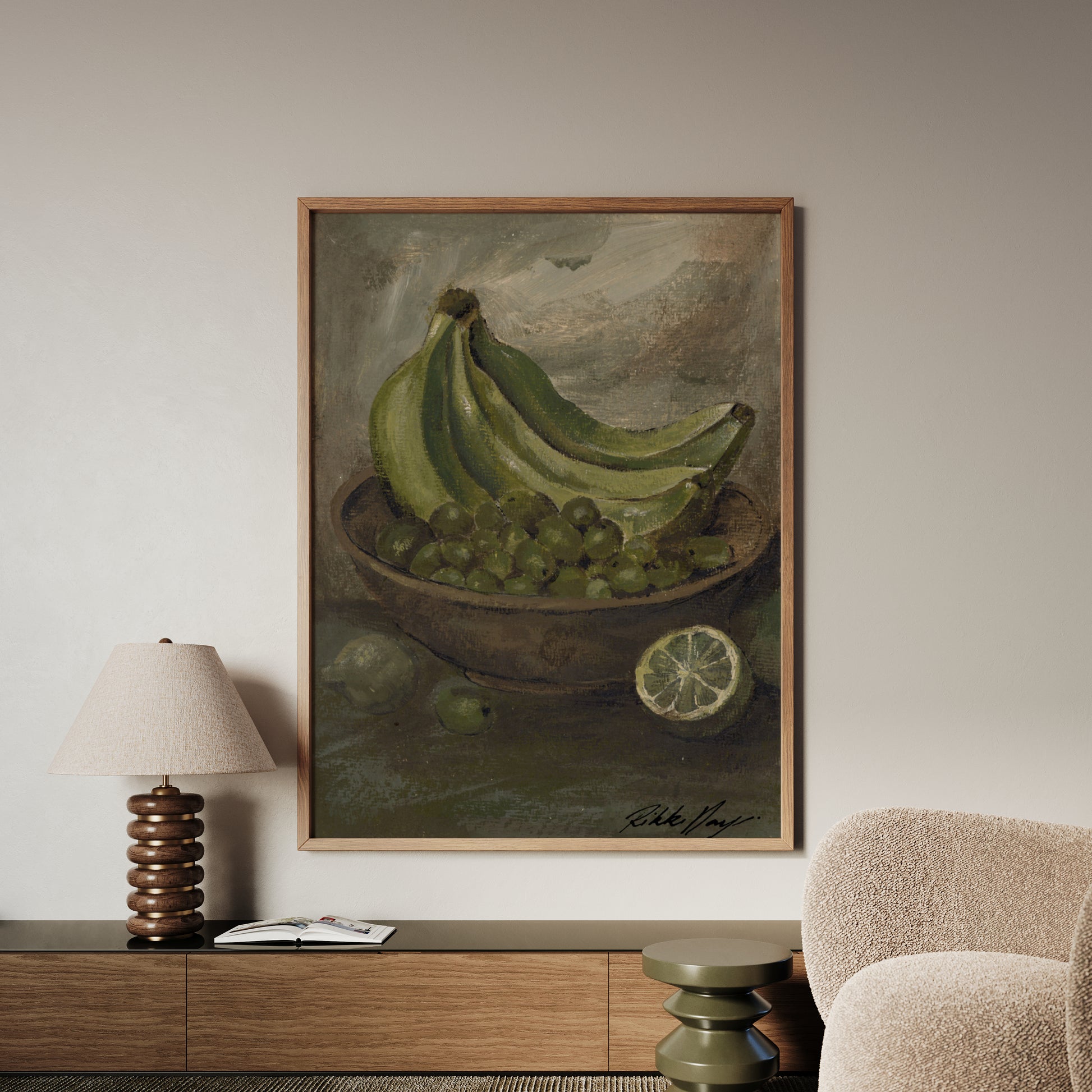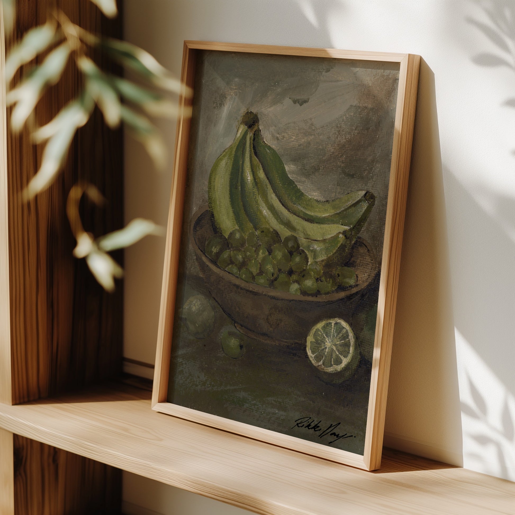Artwork Story: Reminiscent of a vintage Hawaiian still life, this pieces echoes tranquility to me. One of my favourites of the series. Comforting green hues across the bananas, green olives and limes making me feel like i've got nowhere to be. Except maybe in the sun. Green hues in colour psychology represent nature, growth and renewal evoking feelings of safety balance and harmony in the home.