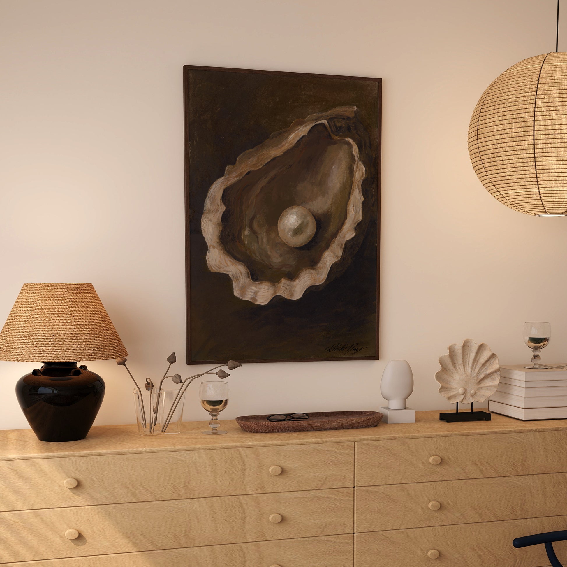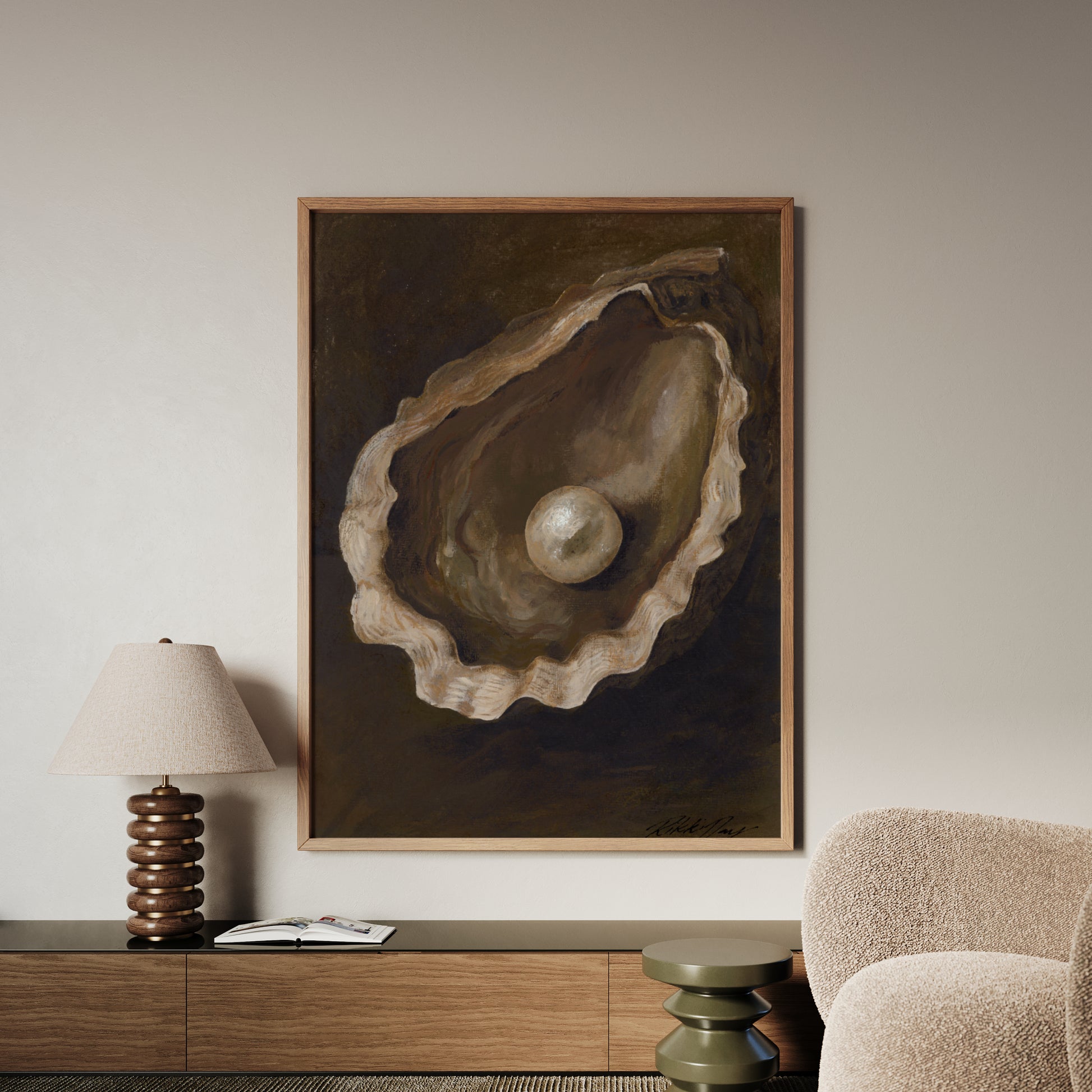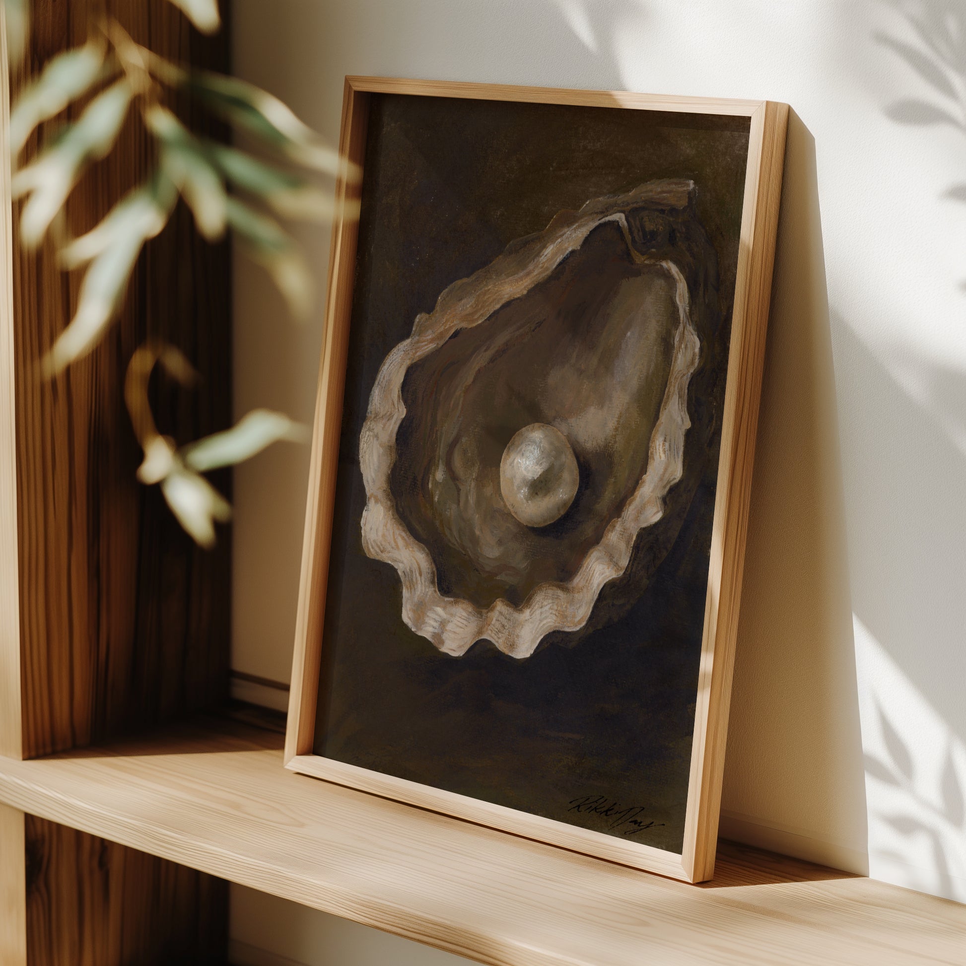 Artwork Story: Soft, tonal, intriguing and dynamic, the oyster. Pearls are made when some sort of irritant like a piece of shell or sand enters the oyster. As a protective method the oyster coats the imperfection with a substance called mother of pearl. It can take years but eventually the "imperfection" becomes the pearl. I think this is a beautiful metaphor for life. Our imperfections over time often becoming our most treasured features.