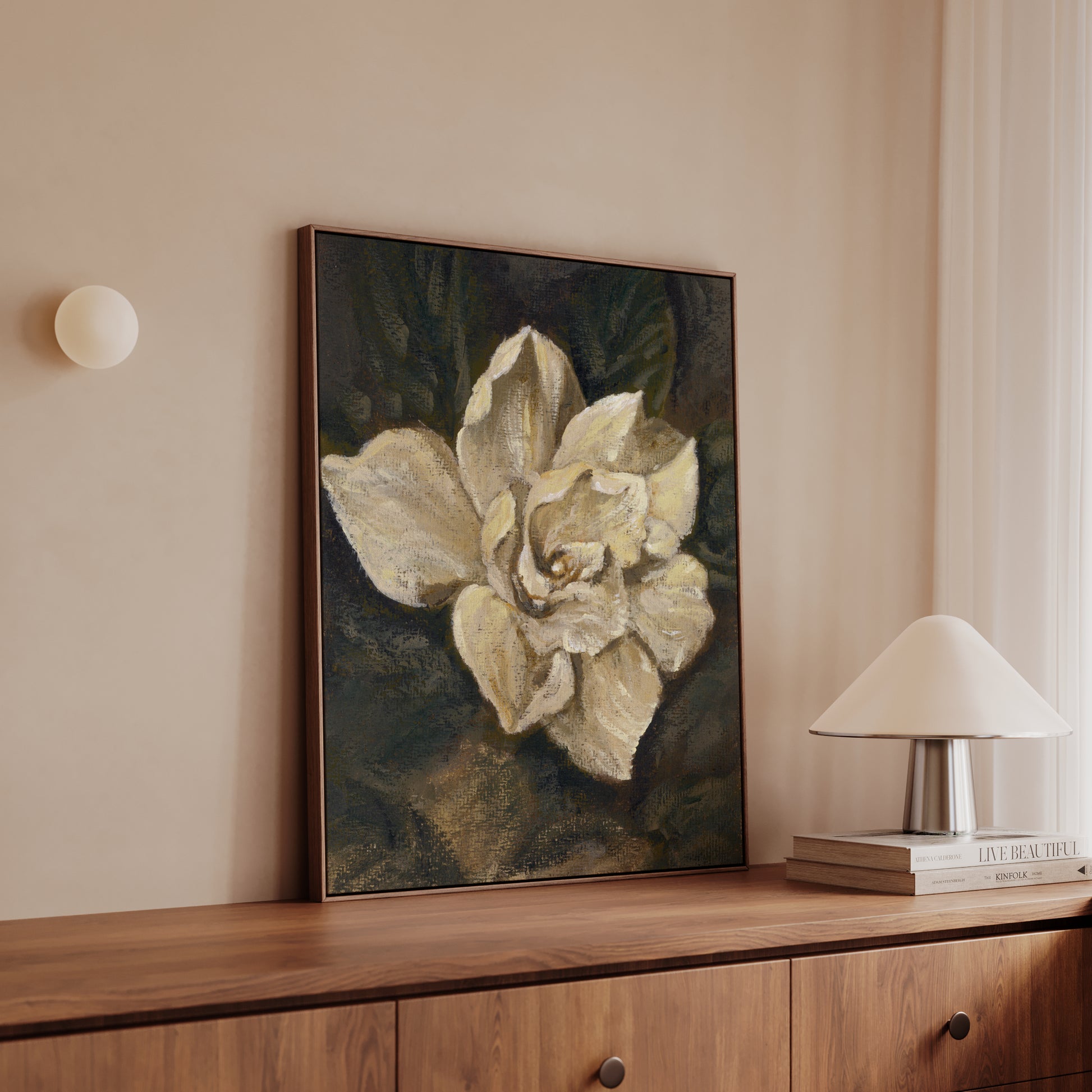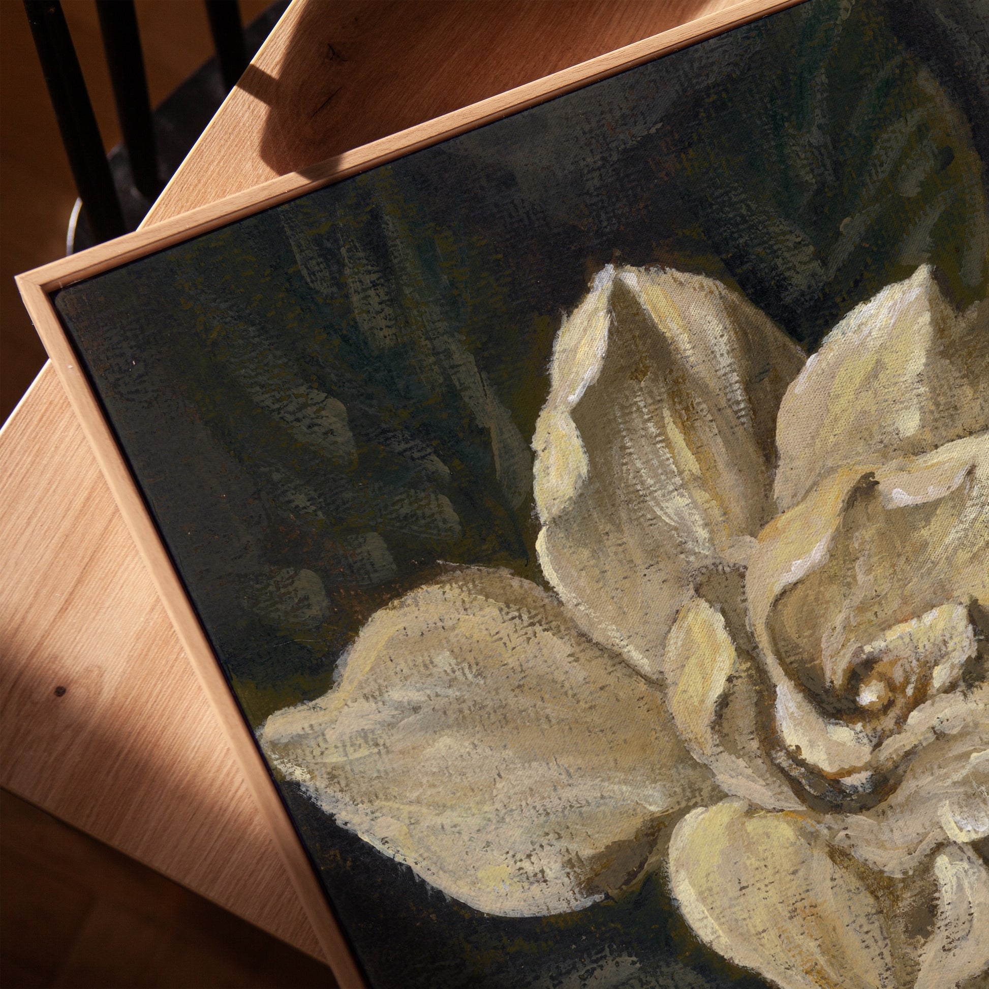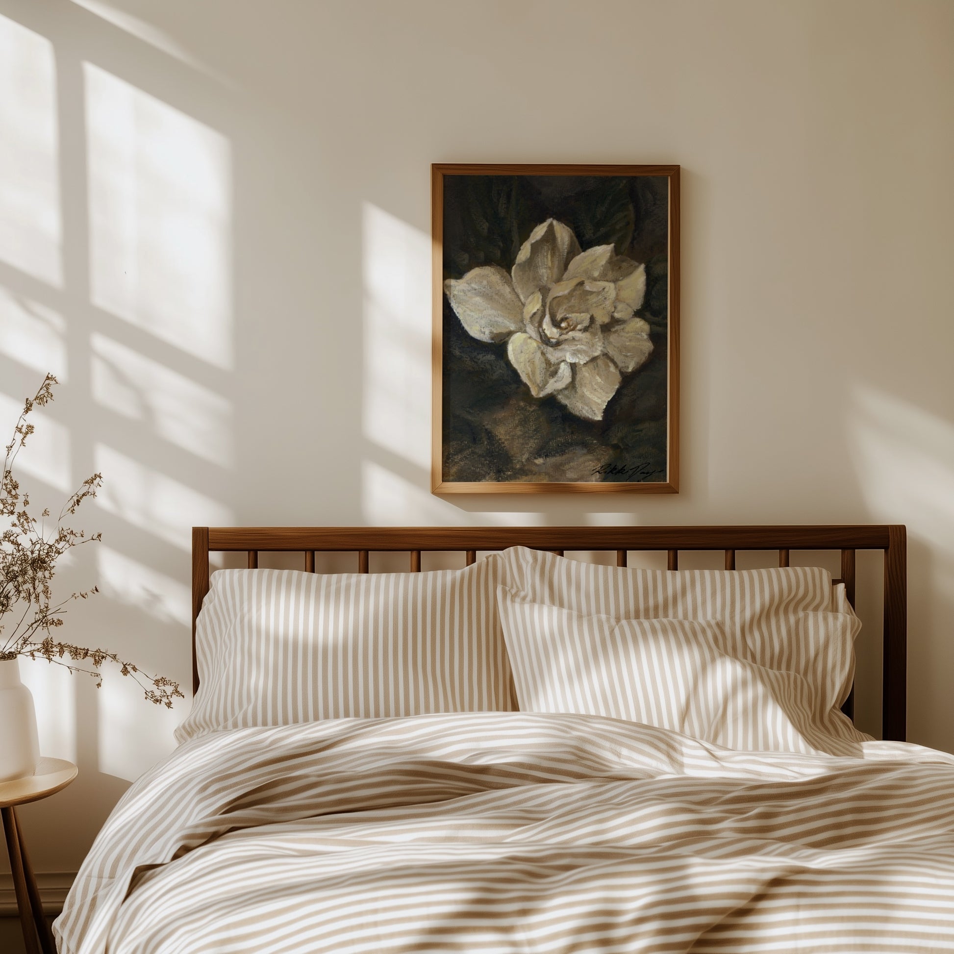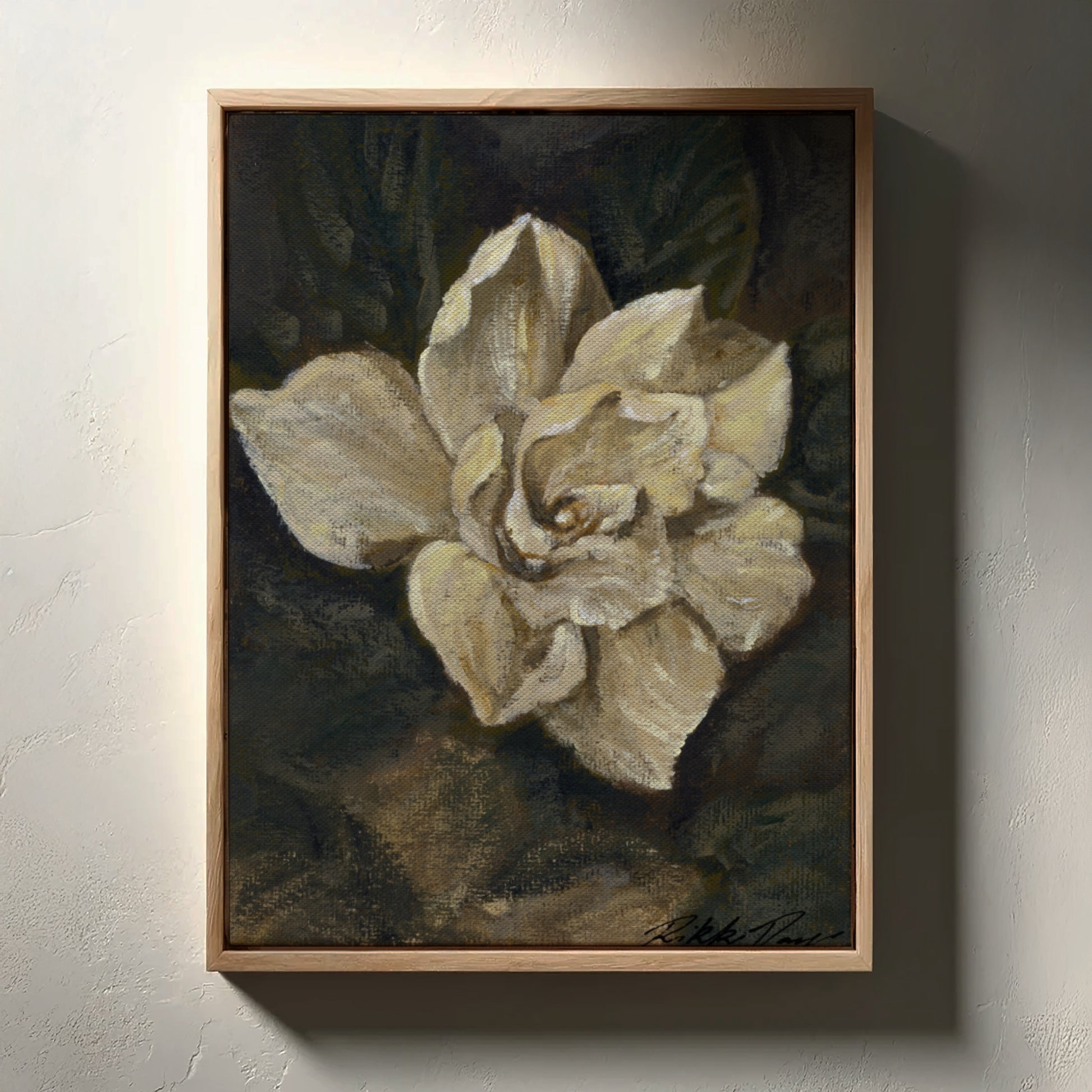Artwork Story: The deep inhale after plucking a ripe Gardenia flower from the garden. It will always smell like home to me and be one of my favourite scents. One of my most treasured memories is watching my daughter Freya smell her first Gardenia at home in our courtyard. Her tiny little eyes glittering with wonder as she smelt the sweetness for the very first time.